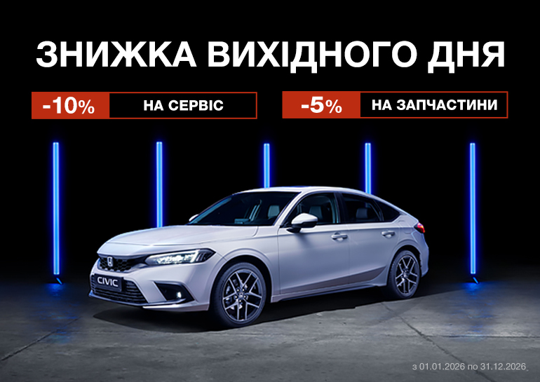 *Срок действия предложения с 01.01.2026 по 31.12.2026. Условием предоставления скидки может быть только оформление заказа-наряда в воскресенье. Акционное предложение не суммируется с другими акционными предложениями и скидками. Право на получение скидки на сервисные работы и запасные части по данному предложению имеют только физические лица, по адресу: ул. Киевская, 53, с. Чубинское, Бориспольский р-н., Киевская обл., Украина. Клиент имеет возможность получить скидки по данной Акции на сервисные работы и на запасные части только при условии приобретения всех запасных частей в ДЦ и их установки (через открытие наряд-заказа). В случае предоставления заказчиком своих запчастей для обслуживания или ремонта, скидка не применяется на соответствующие работы по установке/использованию этих запчастей.